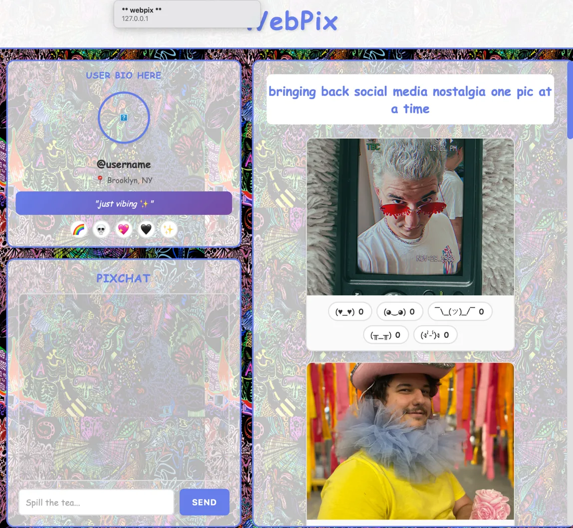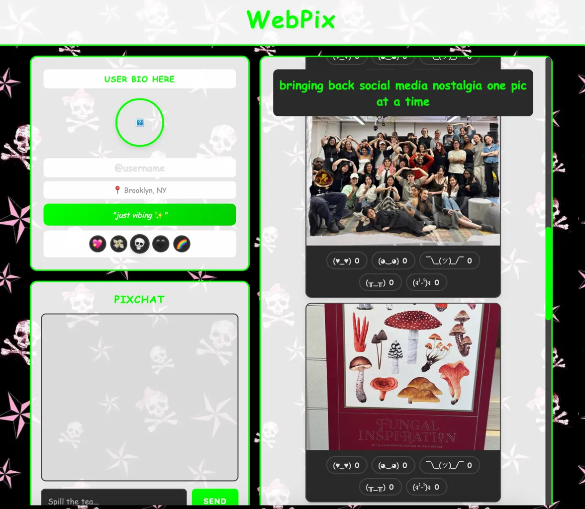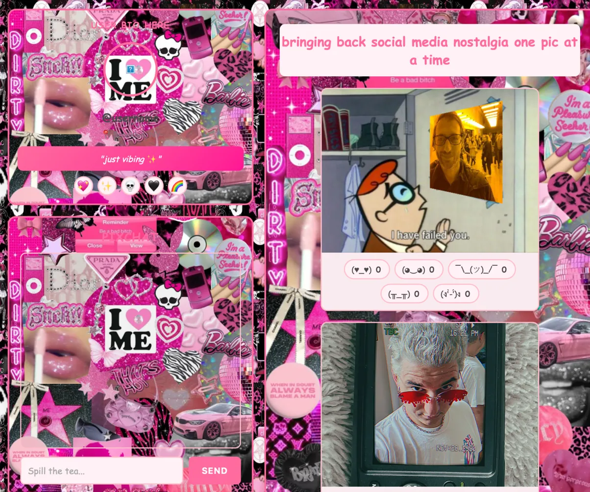 Originally we were thinking about making a photosharing app like instagram with comments and all that but we quickly realized that without paying for render the workaround this would have been way longer and more challenging than we thought. We decided to tone our idea down and pivot to something more achievable which ended up being way cooler anyway. We went with a myspace tumblr early 2000s social media webbrowser aesthetic, basically full y2k nostalgia vibes the whole vibe was about recreating that raw early internet experience where everyone had wild customizable profiles and chatrooms. we wanted it to feel authentic to that era not just like modern design trying to look retro. After sharing our ideas with the class and discussing with Craig it was clear we wouldn't be able to achieve our original vision thus we pivoted to focusing on how we could deliver our concept without having all the features we previously imagined.